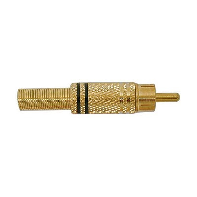Gold contact/body RCA plug with metal strain relief. 5.5mm dia. Package of 10 with Black band.