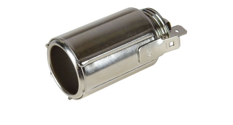 Panel mounted lighter jack with 22mm (7/8") mounting hole, 63mm (2.5") depth. Two piece threaded collar with solder tabs.