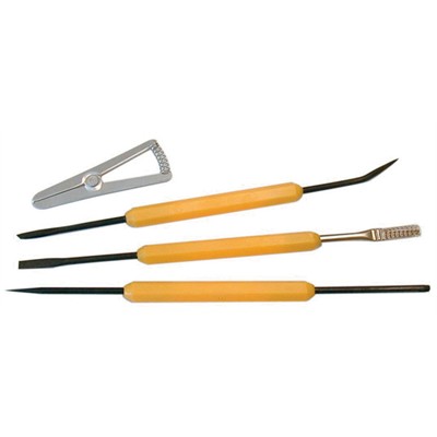 4-piece kit of the most useful instruments in electronic soldering. Kit includes a heatsink, knife/brush, scraper/hook, and a fork/pick tool.