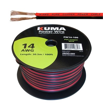 14 AWG (41/0.25mm) Stranded Copper Wire. 2 Conductor, Black/Red. PVC insulation. 4mm x 8mm OD. 100ft Roll.